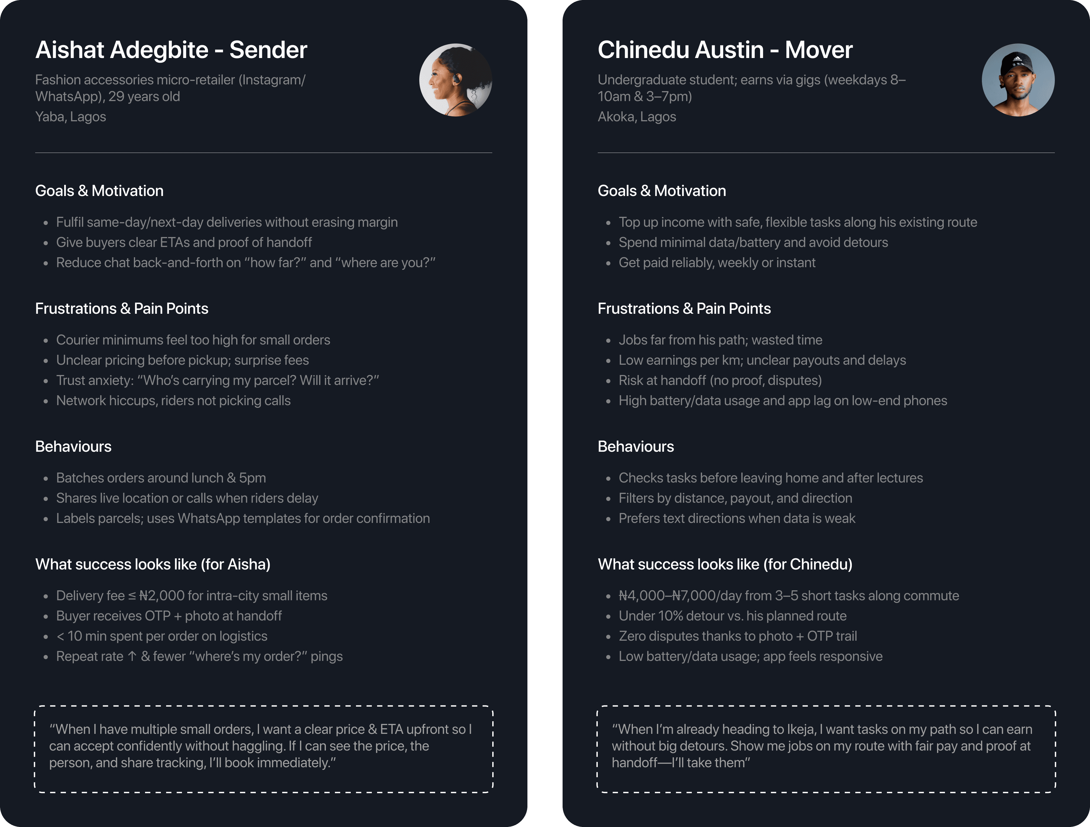 Meet Aisha and Chinedu—the sender who needs price clarity and the mover who needs fair, on-route work with visible protection.